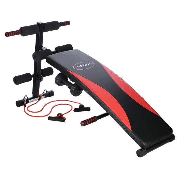Šikmá lavička se závažím určena pro domácí použití. Je určena k tréninku břišních svalů, boků a páteře. Díky vinylovým činkám může uživatel provádět trénink horní poloviny těla.