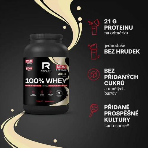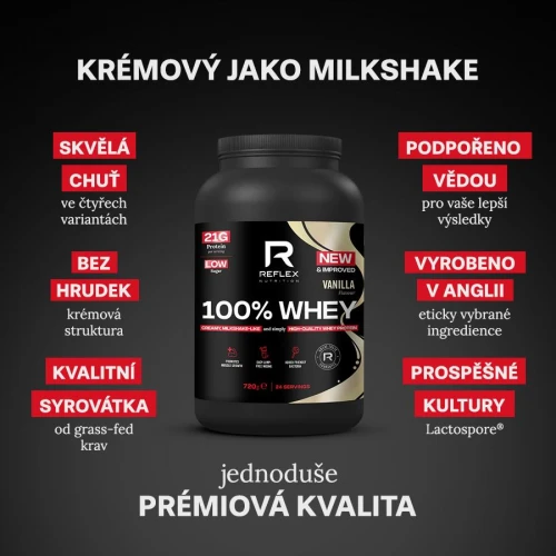 - 100% Whey nabízí krémovou a lahodnou texturu, ve formě mléčného šejku s bohatou chutí.
