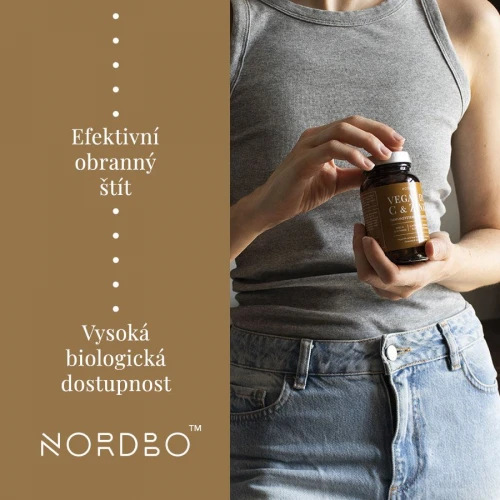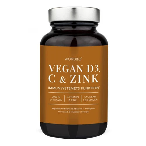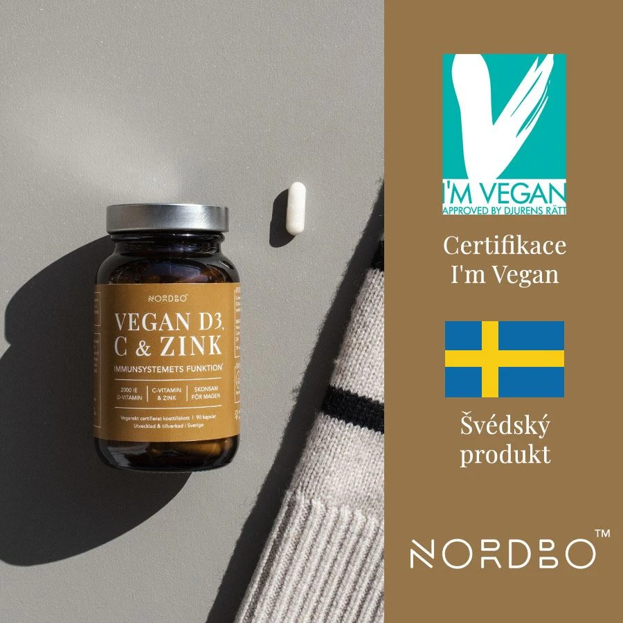 Nordbo Vegan D3, C & Zink obsahuje komplex tří složek zaměřených na efektivní obranný štít a podporu během zimního období a vysoké zátěže. Obsahuje veganský vitamín D3 (cholekalciferol) extrahovaný z lišejníku, vitamín C a zinek v biologicky aktivních formách. Všechny tři složky jsou ve velmi vysoké dávce a všechny tři se navzájem svými účinky podporují. Vitamín C je v kysele neutrální formě askorbátu vápenatého, je tedy šetrný k žaludku, zinek je v chelatované formě pikolinátu zinečnatého, kdy je zinek vázaný s kyselinou pikolinovou (přirozený metabolit tryptofanu), a je tedy velmi dobře dostupný pro tělo. Doplněk obsahuje přidané MCT tuky z kokosu pro zlepšení vstřebání vitamínu D, který je rozpustný v tucích.