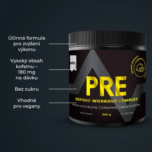 Maximalizujte svůj plný tréninkový potenciál s naším PRE Workout Complexem. Tato propracovaná předtréninková formule je navržena tak, aby vám dodala explozivní energii, maximální soustředění a intenzitu pro každý trénink. Kombinuje účinné látky podporující sílu, výkon a vytrvalost v pečlivě vyváženém složení. Každá dávka obsahuje optimální množství L-citrulinu, argininu AKG, beta-alaninu, kreatin monohydrátu a 180 mg kofeinu, které společně podporují prokrvení svalů, oddalují únavu a zvyšují výkon. To vše s nulovým obsahem cukru, jde tak o ideální volbu pro čistou a efektivní předtréninkovou výživu. Kofein přispívá ke zvýšení vytrvalostního výkonu a kapacity a pomáhá zlepšit koncentraci a bdělost. Kreatin prokazatelně zvyšuje fyzickou výkonnost při opakovaných krátkodobých, vysoce intenzivních výkonech – pozitivního účinku je dosaženo při denní dávce 3 g. Prášek se snadno rozpouští a nabízí osvěžující příchuť citrón, která vás příjemně naladí před výkonem. Užijte 20–30 minut před tréninkem a vytěž ze svého cvičení maximum. Pro ještě lepší výsledky doporučujeme kombinovat s Intra Powder, který poskytne podporu a energii po celou dobu náročného tréninku. PRE Workout Complex = energie, fokus a výkon. Žádné kompromisy z hlediska jedinečné chuti a složení. Finská značka PULS NUTRITION patří ve všech ohledech k absolutní špičce sportovní a doplňkové výživy.