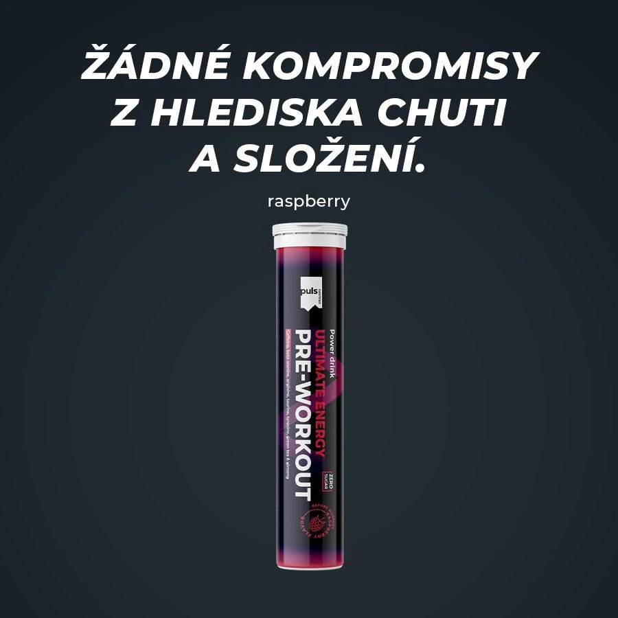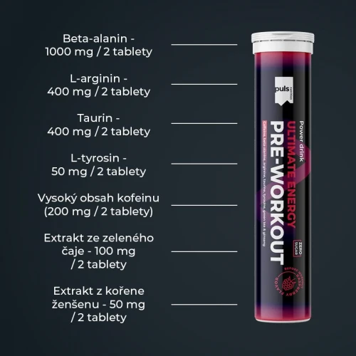 Tréninkový booster pro vyšší vytrvalost. Šumivé tablety PULS Pre-workout se snadno používají i na cestách. Jsou vyrobeny z účinných složek podporujících výkon, které pomáhají zvládnout i ty nejnáročnější tréninky. Byly vyvinuty především pro podporu silového tréninku, ale jsou ideální pro jakýkoli sport. Obsahují silnou kombinaci L-argininu, beta-alaninu, taurinu, L-tyrosinu a rostlinných extraktů - ze zeleného čaje a kořene ženšenu. Vysoký obsah kofeinu (200 mg / 2 tablety) pomáhá zvýšit vytrvalostní výkon a kapacitu během tréninku. Pochutnáte si na svěží příchuti maliny.