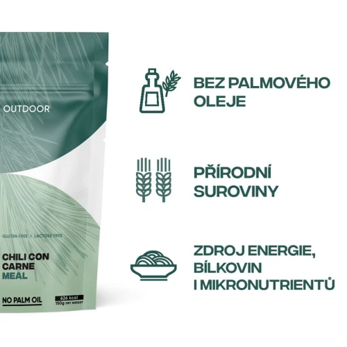 Chutné a syté jídlo pro jakýkoli typ turistiky. Lze jej kompletně připravit v sáčku, stačí přidat vodu a na 15 minut zase uzavřít. Sáček je vodotěsný a hmyzutěsný, je vyrobený tak, aby nehrozilo pořezání. Jídlo si tak můžete vychutnat bez zbytečné dlouhé přípravy a mytí. pokrm je bez palmového oleje, bez lepku a bez laktózy. Je připravené z přírodních složek, má komplexní výživový profil - v jedné 530 g porci najdete 69 g sacharidů, 23 g bílkovin, 4 g vlákniny a také antioxidanty - alfa tokoferol a extrakt z rozmarýnu. Pokrm neobsahuje umělá sladila nebo glutamát.