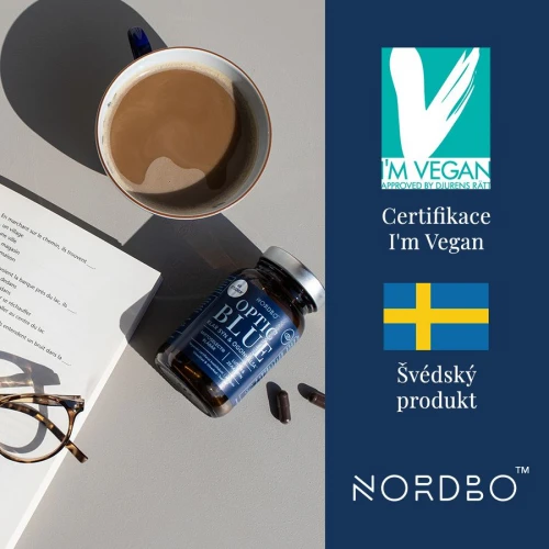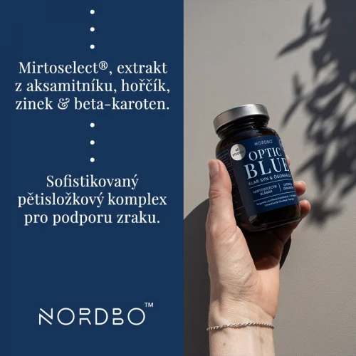 Nordbo Optic Blue je doplněk určený pro podporu stavu očí a zraku. Obsahuje Mirtoselect®, extrakt z aksamitníku, hořčík, zinek a beta-karoten.