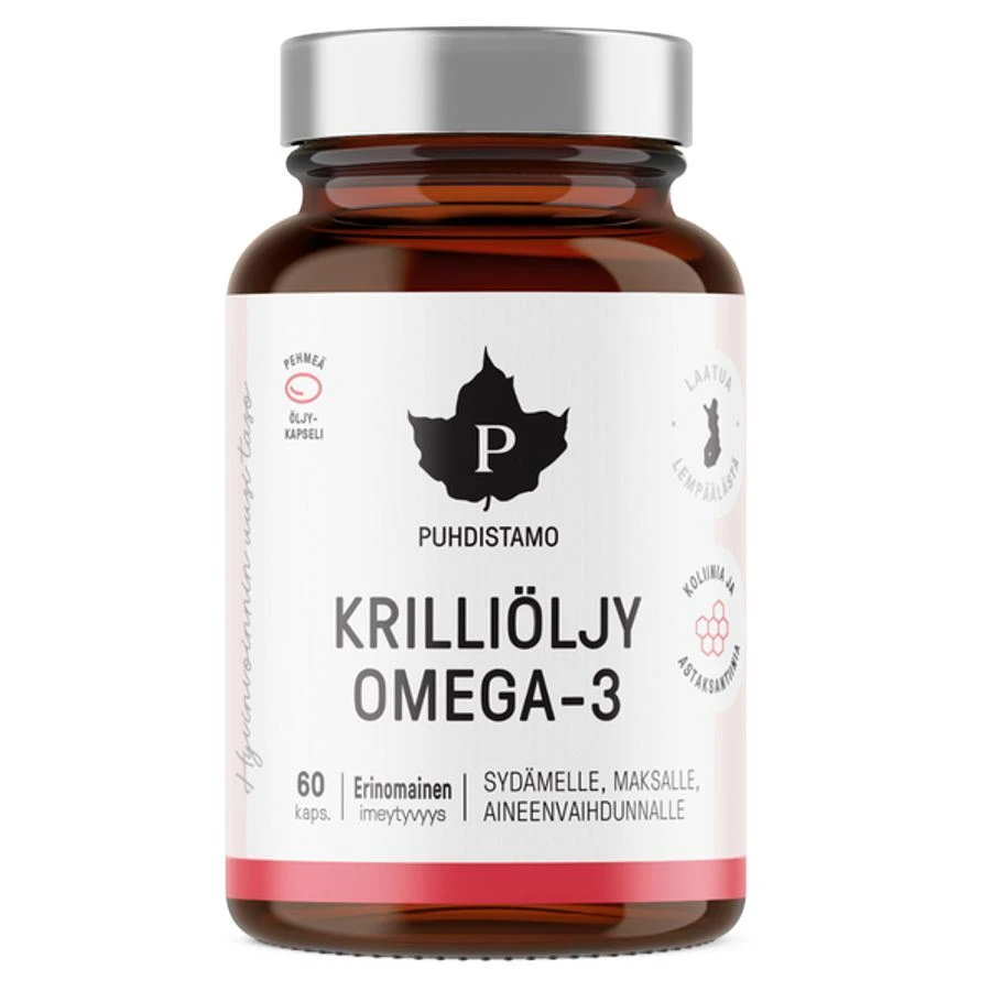 Omega-3 ze superčistého zdroje – krillu žijícího v oceánu kolem Antarktidy, kde je nejčistší mořská voda na světě. Omega-3 jsou získané metodou Ecoharvest, která minimalizuje nechtěný úlovek, kdy jsou uloveni i jiní mořští živočichové (tak je to běžné u rybolovu, který je nejběžnějším zdrojem produktů omega-3). Krill použitý pro výrobu Omega-3 Puhdistamo žije v mořích daleko od rafinérií a velkého lodního provozu, výsledný produkt si proto udržuje vysokou čistotu. Omega-3 jsou navíc v přírodní fosfolipidové formě, která je pro tělo přirozená a tedy i vysoce využitelná (lze srovnat s konzumací celých ryb).