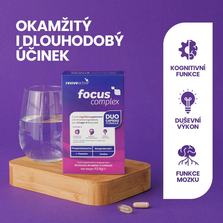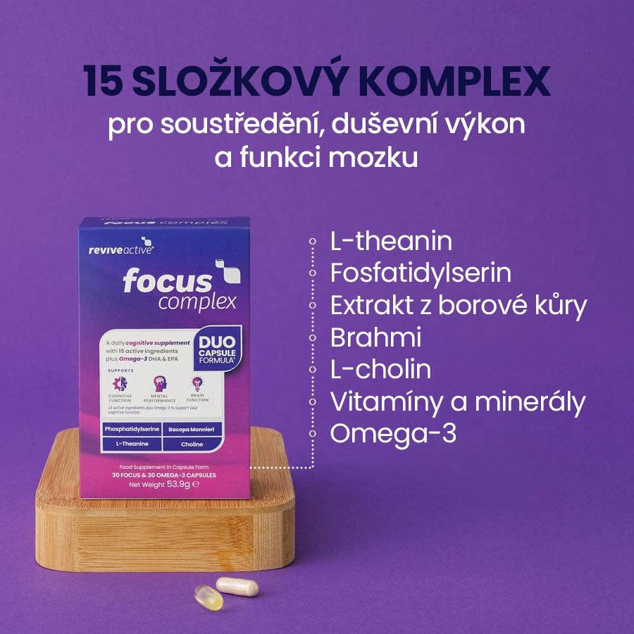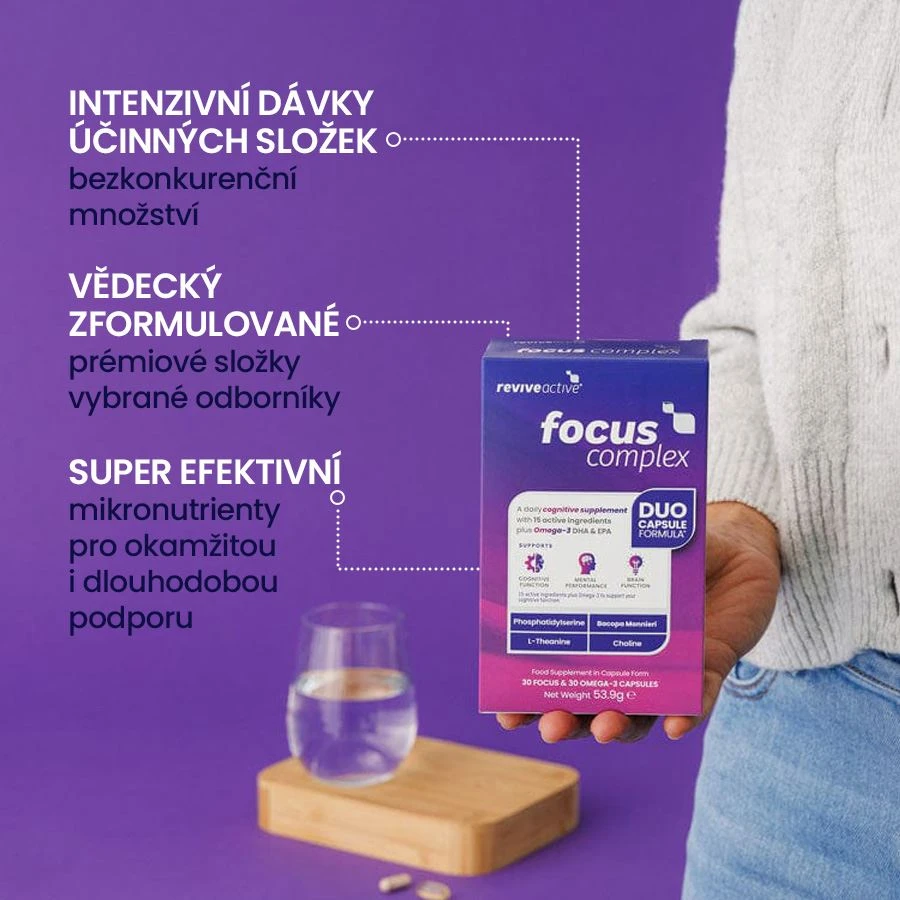 Focus obsahuje 15složkový komplex ve dvou druzích kapslí - Focus kapsli se složkami L-theanin, L-cholin a Brahmi, které působí velmi rychle. L-theanin snižuje pocit napětí, Brahmi a L-cholin posilují funkci mozku. Extrakt z kůry mořské borovice (Pinus pinaster) má vlastnosti související s oxidativním stresem. Focus dále obsahuje kyselinu listovou ve formě bioaktivního folátu, vitamíny B5, B6, B12, C, D3, E, jód, měď a zinek. Druhá kapsle obsahuje rybí olej (zdroj omega-3 DHA a EPA). To vše bez obsahu nežádoucích a balastních aditiv!