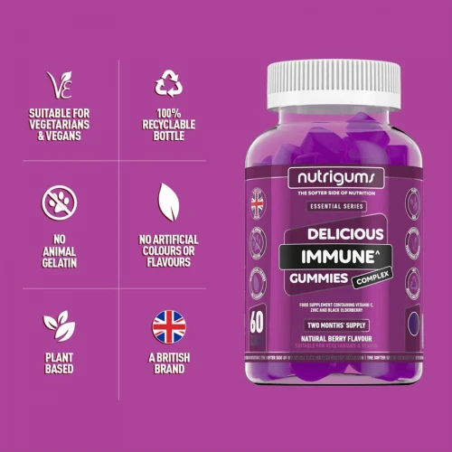 Vitamínová želé nemusí být plná umělých sladidel a barviv! Jde si pochutnat i bez syntetických látek. Želé Nutrigums® Immune Complex má lahodnou přírodní   příchuť lesní ovoce a lehce se konzumuje. Tělu dodává všechny benefity extraktu z černého bezu, zinku a vitamínu C = posiluje obranný štít a má také vlastnosti související s oxidativním stresem.