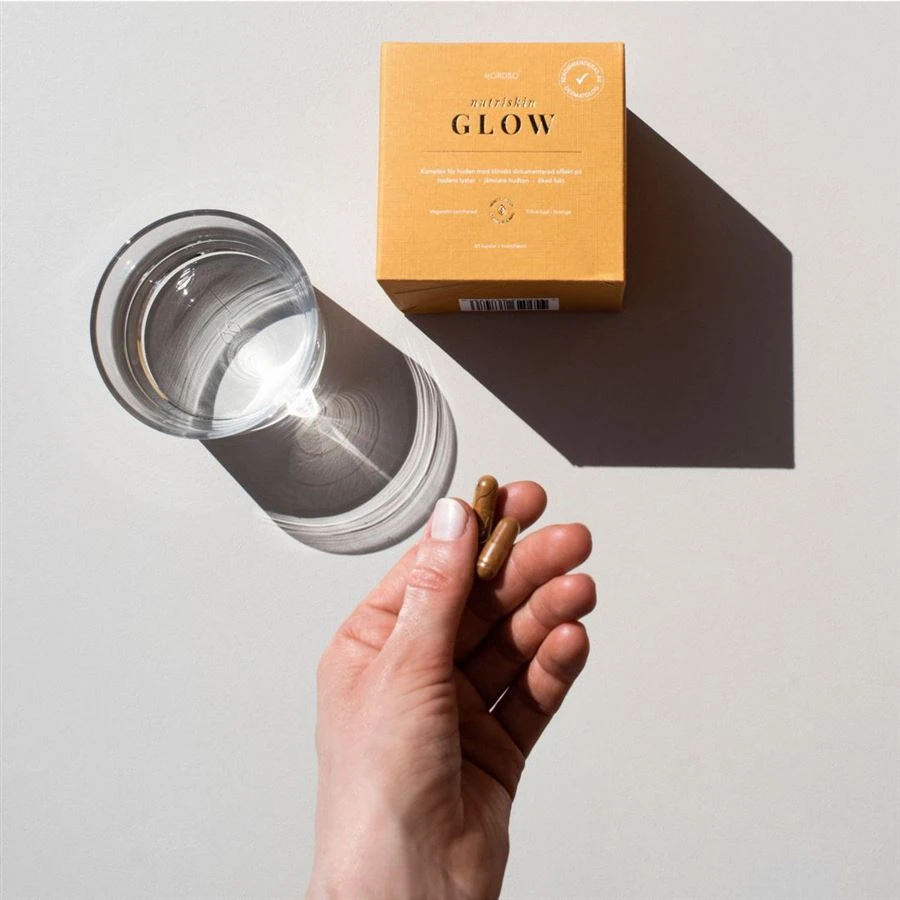 Nutriskin Glow je přírodní kapslový doplněk pro unavenou a suchou pleť. Nutriskin obsahuje výhradně účinné přírodní složky - unikátní přírodní extrakty zaměřené na lesk a rovnoměrný tón. SepitoneTM je standardizovaný extrakt z fermentovaných borůvek s komplexem proantokyanidinů a antokynidinů, velmi silných přírodních látek, jejichž vlastnosti souvisejí s oxidativním stresem, tvorbou kolagenu, elasticitou a oběhem. Extrakt z kurkumy obsažený v Nutriskin Glow obsahuje 95 % (!) kurkumionoidů - účinných látek zaměřených na oblast oxidativního stresu. Podobné vlastnosti má i extrakt ze šípku a extrakt z plodů aceroly.