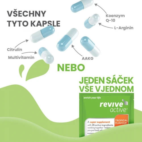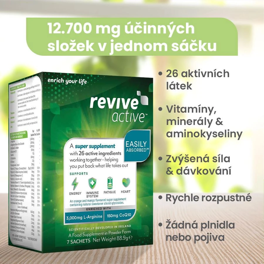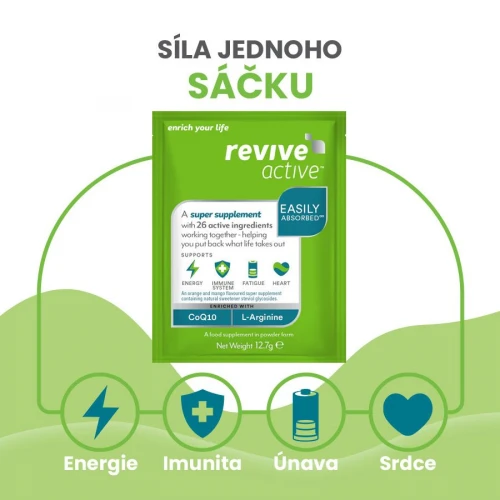 Revive Active není další multivitamín, jde o superdoplněk s množstvím účinných látek, které je pro multivitamíny zcela netypické. Revive Active se od jiných produktů odlišuje unikátní a velmi silnou kombinací vitamínů, minerálů a aminokyselin kombinovaných s dalšími složkami jako je koenzym Q10, L-arginin a citrulin. Prášek je snadno rozmíchatelný ve vodě nebo libovolném nápoji. Jeden sáček dodá potřebné mikronutrienty pro celý den. Doplněk je vhodný pro vegany, je kompletně bez lepku a je slazený steviol-glykosidy.