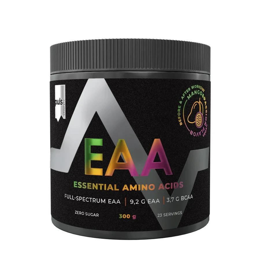 Podpořte růst svalů a regeneraci s naším Full-Spectrum EAA práškem. Každá porce dodá 9,2 g esenciálních aminokyselin, včetně 3,7 g BCAA, které jsou klíčové pro syntézu svalových bílkovin, výkon a ochranu svalové hmoty. Tato formule je bez cukru a je navržená tak, aby pomáhala předcházet svalovému rozpadu, zvyšovala výkonnost a urychlovala regeneraci. Osvěžující příchuť mango a mučenka potěší bez zbytečných kalorií – bez tuku a bez sacharidů. Přidaná vláknina navíc podporuje správné trávení a celkový komfort při užívání. Ideální pro užívání před, během nebo po tréninku. Pro kompletní regeneraci doporučujeme po tréninku zařadit plnohodnotné jídlo. Pokud potřebujete rychlé doplnění živin, sáhněte ihned po tréninku po proteinovém nebo regeneračním nápoji, který pomůže doplnit zásoby bílkovin a glykogenu. Full-Spectrum EAA – čistá podpora výkonu, ochrana svalů a rychlejší regenerace. Žádné kompromisy z hlediska jedinečné chuti a složení. Finská značka PULS NUTRITION patří ve všech ohledech k absolutní špičce sportovní a doplňkové výživy.