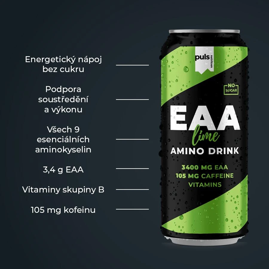 Funkční Amino Energy. Energie a výkon s limetkovým nádechem – dopřejte si pořádnou vzpruhu s naším nejnovějším EAA nápojem. Tento energetický nápoj bez cukru obsahuje výrazných 105 mg kofeinu, 3,4 g EAA a vitamíny skupiny B. Je navržen tak, aby podpořil výkon, vytrvalost a pomohl snížit únavu a vyčerpání. Kofein přispívá ke zvýšení vytrvalostního výkonu a vytrvalostní kapacity a pomáhá zlepšit soustředění. Vitaminy B6 a B12 podporují normální energetický metabolismus a přispívají ke snížení míry únavy a vyčerpání. Žádné kompromisy z hlediska jedinečné chuti a složení. Finská značka PULS NUTRITION patří ve všech ohledech k absolutní špičce sportovní a doplňkové výživy.