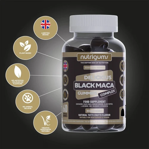 Vitamínová želé nemusí být plná umělých sladidel a barviv! Jde si pochutnat i bez syntetických látek. Želé Nutrigums® Black Maca má lahodnou příchuť tutti frutti a lehce se konzumuje. Tělu dodává všechny benefity černé macy, korejského ženšenu, selenu, zinku a vitamínu B6. Tyto složky mají synergní účinek a vlastnosti související s vitalitou, hladinou energie a testosteronem.
