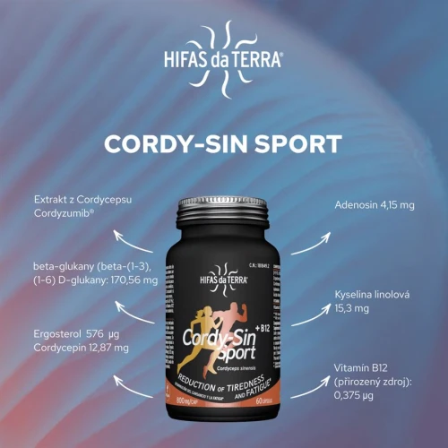 Cordy Sin Sport obsahuje houbu Cordyceps, která je ve východních kulturách známá pro své energizující a posilující vlastnosti. Jeden z jejich mnoha názvů je Tibetská viagra. Obsahuje přirozeně se vyskytující ergosterol, cordycepin, mannitol a adenosin, přirozeně energizující přírodní sloučeniny.