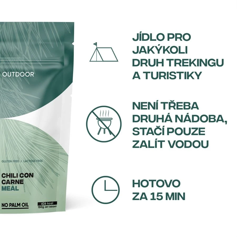 Chutné a syté jídlo pro jakýkoli typ turistiky. Lze jej kompletně připravit v sáčku, stačí přidat vodu a na 15 minut zase uzavřít. Sáček je vodotěsný a hmyzutěsný, je vyrobený tak, aby nehrozilo pořezání. Jídlo si tak můžete vychutnat bez zbytečné dlouhé přípravy a mytí. pokrm je bez palmového oleje, bez lepku a bez laktózy. Je připravené z přírodních složek, má komplexní výživový profil - v jedné 530 g porci najdete 68 g sacharidů, 19 g bílkovin, 6,5 g vlákniny a také antioxidanty - alfa tokoferol a extrakt z rozmarýnu. Pokrm neobsahuje umělá sladila nebo glutamát.