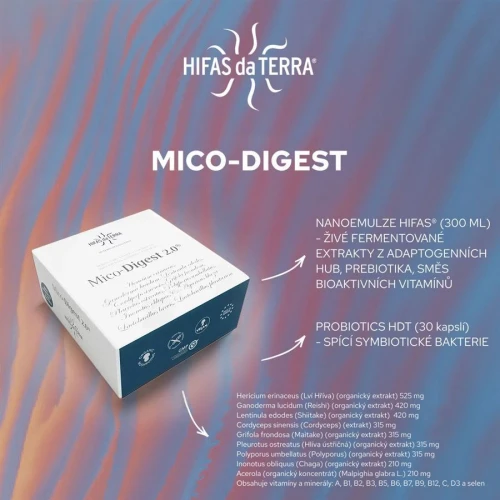 Receptura Mico Digest je založena na symbióze silných bioaktivních extraktů z adaptogenních hub, které jsou upraveny procesem fermentace a následně převedeny do formátu nanoemulze, která zvyšuje biologickou dostupnost a vstřebávání až o 70 %.