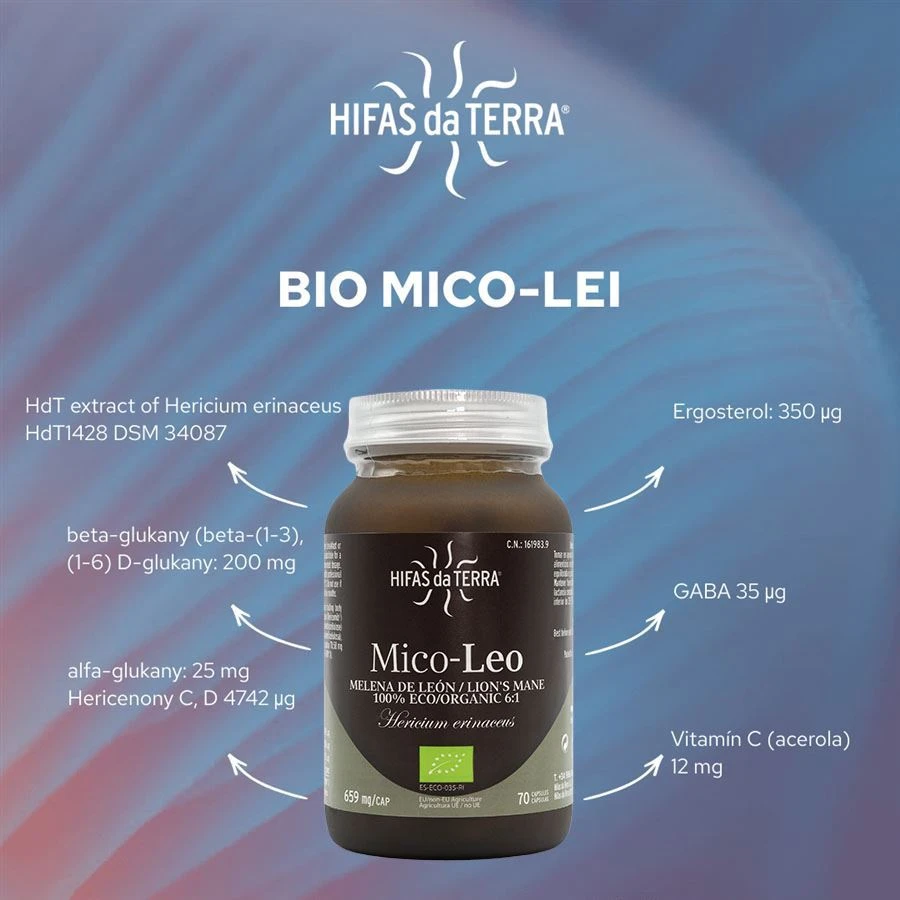 MICO LEO - Lví hříva neboli Hericium je známá také jako Yamabushitake, Hou Tou Gu (Monkey head mushroom) nebo hedgehog mushroom. Jde o vizuálně atraktivní houbu díky velké bílé "hřívě" vypadající jako zamrzlý vodopád. Hericium obsahuje bioaktivní sloučeniny a molekuly, jejichž vlastnosti souvisí s mikrobiomem, zažívacím traktem, kognitivními funkcemi a osou střeva-mozek.