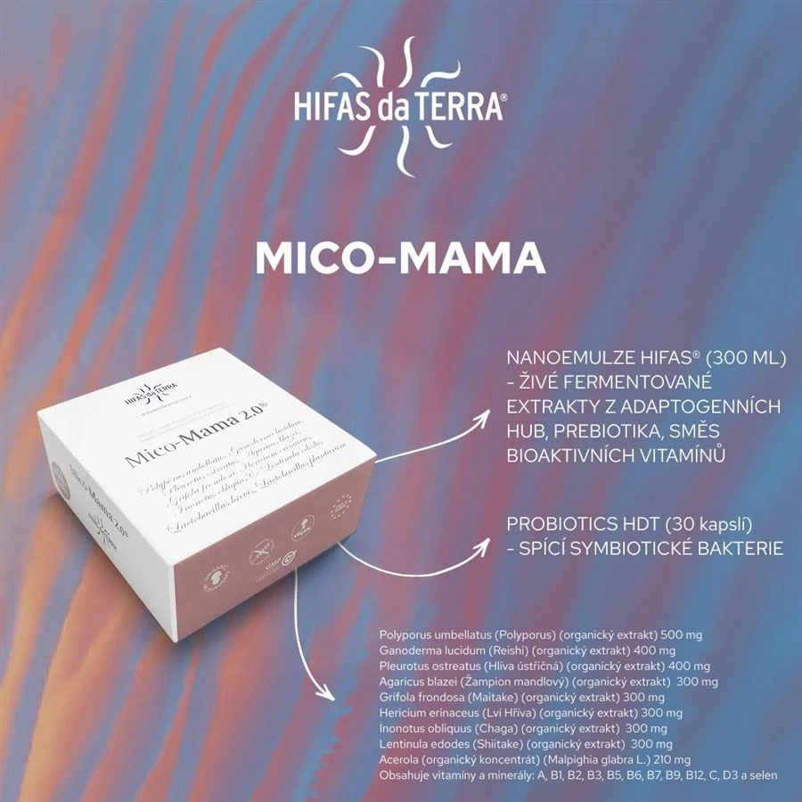Receptura Mico-Mama je založena na symbióze silných bioaktivních extraktů z adaptogenních hub, které jsou upraveny procesem fermentace a následně převedeny do formátu nanoemulze, která zvyšuje biologickou dostupnost a vstřebávání až o 70 %.