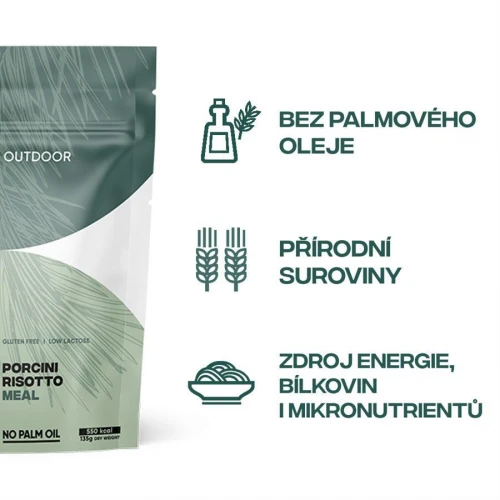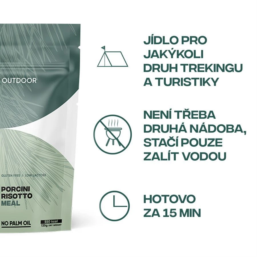 Chutné a syté jídlo pro jakýkoli typ turistiky. Lze jej kompletně připravit v sáčku, stačí přidat vodu a na 15 minut zase uzavřít. Sáček je vodotěsný a hmyzutěsný, je vyrobený tak, aby nehrozilo pořezání. Jídlo si tak můžete vychutnat bez zbytečné dlouhé přípravy a mytí. pokrm je bez palmového oleje, bez lepku a bez laktózy. Je připravené z přírodních složek, má komplexní výživový profil - v jedné 485 g porci najdete 83 g sacharidů, 16 g bílkovin, 5,7 g vlákniny a také antioxidanty - alfa tokoferol a extrakt z rozmarýnu. Pokrm neobsahuje umělá sladidla nebo glutamát.