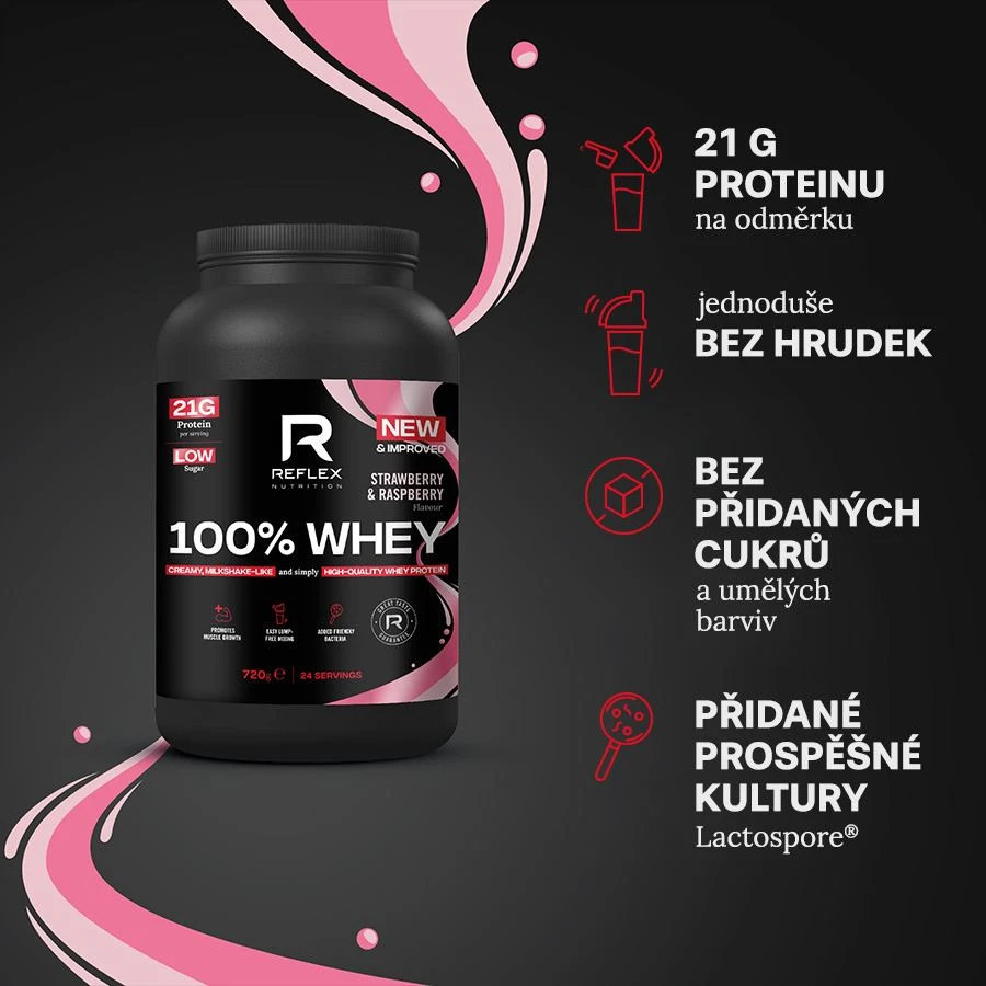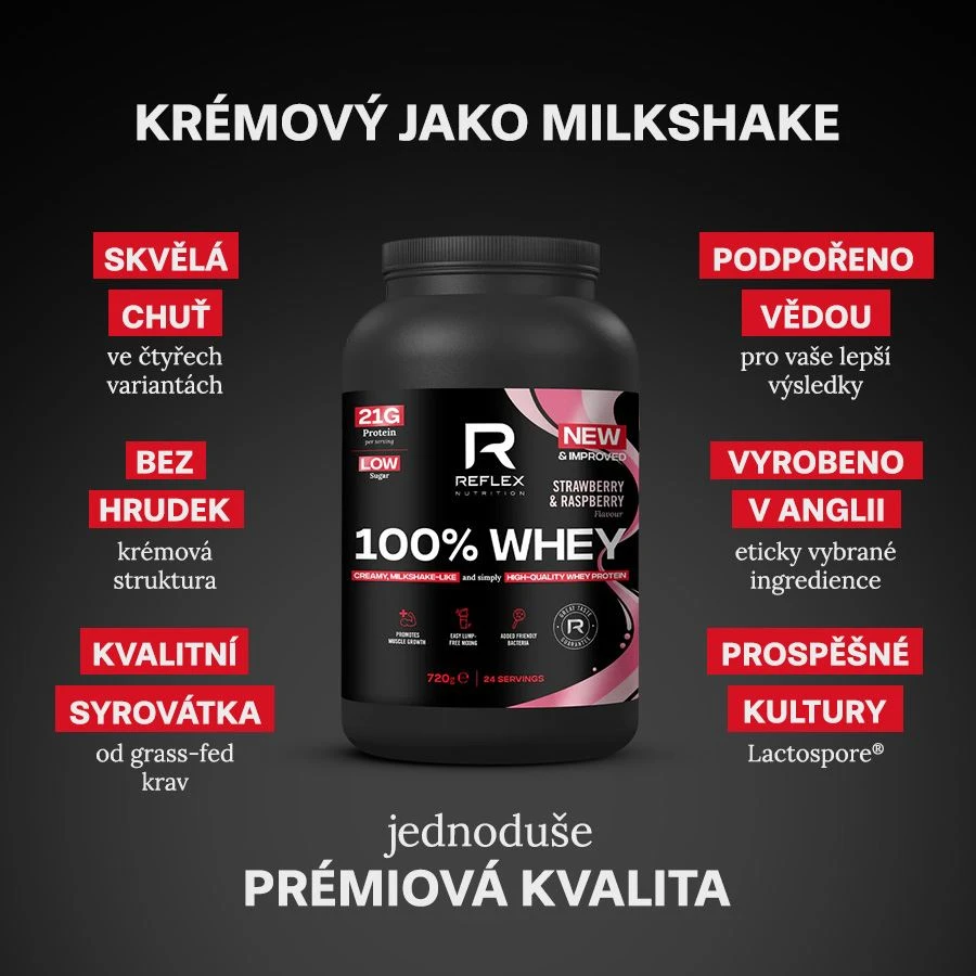 - 100% Whey nabízí krémovou a lahodnou texturu, ve formě mléčného šejku s bohatou chutí.