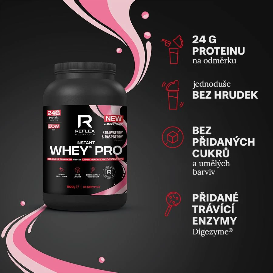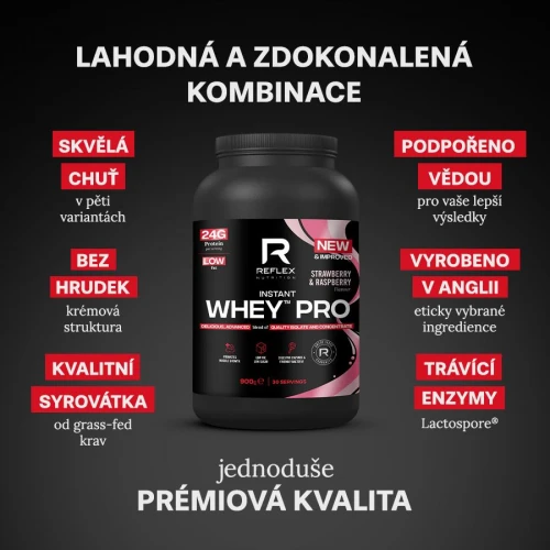 Instant Whey™ PRO je vlajkovou lodí mezi proteiny Reflex Nutrition a je populární z dobrého důvodu. Oproti proteinu použitému ve 100% Whey má nižší obsah tuku, méně kalorií a řidší konzistenci. Je tak skvěle vybalancovaný, i z hlediska vysokého obsahu proteinu. Velmi snadno se konzumuje a zároveň přimíchává do proteinových smoothies nebo kaší.