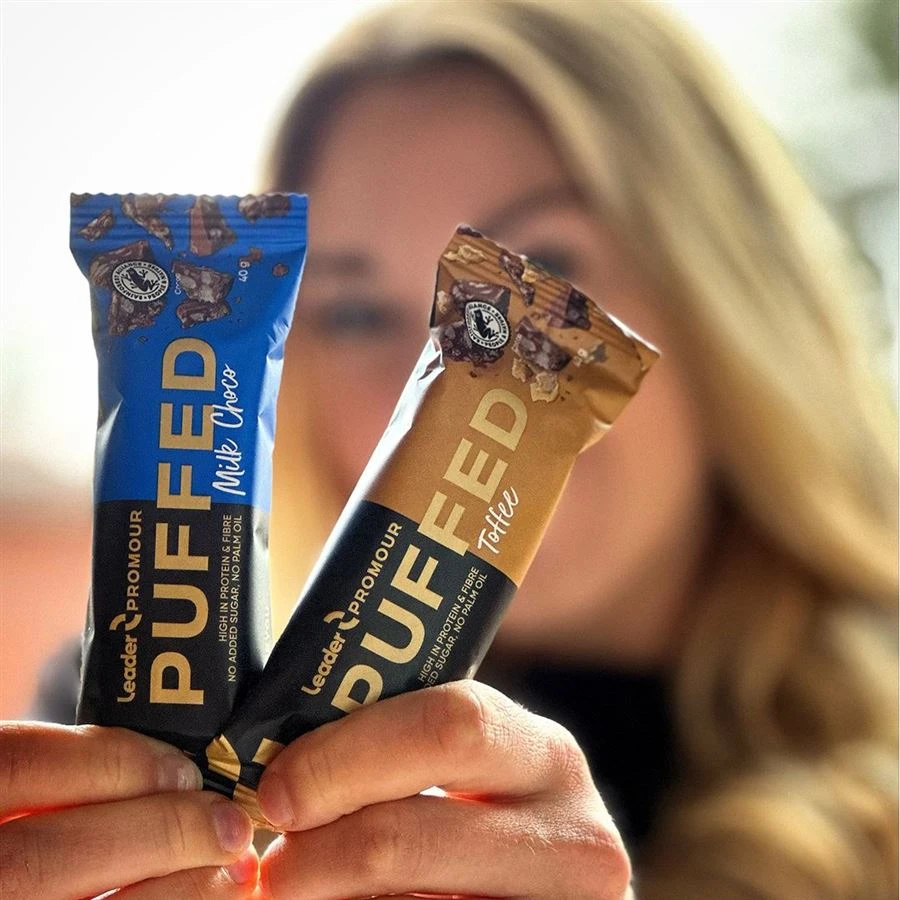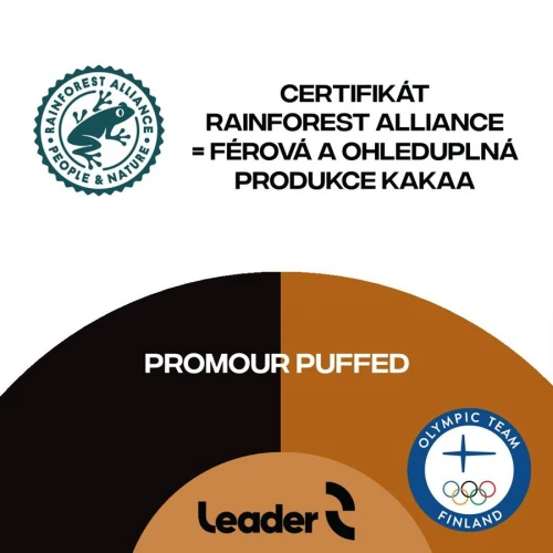 Proteinová tyčinka Promour Puffed kombinuje v lahodném spojení praženou rýži a karamelem. Tyčinka se hodí jako svačina i jako sladkost třeba ke kávě. Obsahuje velké množství vlákniny a naopak žádný lepek. Obsažené kakao je certifikované organizací Rainforest Alliance, která garantuje, že je produkováno za spravedlivých podmínek pro pracovníky, je vyprodukováno šetrně k životnímu prostředí a v souladu s udržitelným rozvojem.