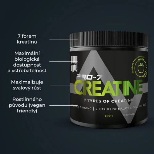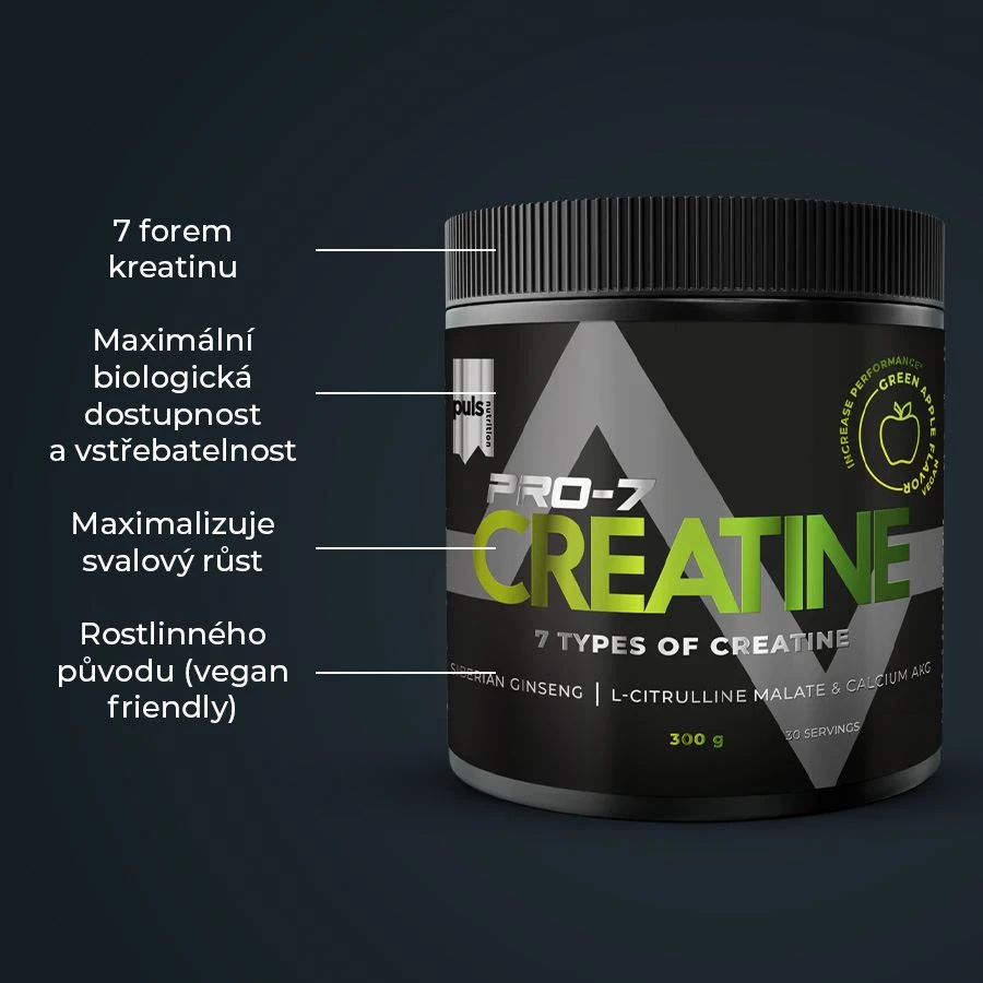 Maximalizujte sílu a výkon. Se sedmi formami kreatinu v jednom. S elektrizující chutí zeleného jablka. Nastartujte své vysoce intenzivní tréninky s PRO-7 Creatine – prémiovou funkční směsí vytvořenou pro ty, kteří míří vysoko. Tento pokročilý produkt obsahuje 7 různých forem kreatinu (!), které společně podporují fyzickou výkonnost, sílu a explozivní výkon. Pro maximální efekt je formule doplněna o kombinaci tří sacharidových zdrojů (maltodextrin, dextróza a kukuřičný škrob waxy maizeTM, jež zajišťují vysokou biologickou dostupnost a efektivní vstřebávání. Tento výkonnostní super produkt s osvěžující příchutí zeleného jablka jde ale ještě dál – obsahuje také kalcium alfa-ketoglutarát, L-citrulin-DL-malát a sibiřský ženšen, které podporují výkon, prokrvení svalů a odolnost vůči zátěži. PRO-7 Creatine používejte stejně jako běžný kreatin. Pravidelné užívání kreatinu pomáhá budovat čistou svalovou hmotu, zlepšuje regeneraci mezi sériemi a zvyšuje celkovou tréninkovou kapacitu – díky tomu můžete trénovat tvrději a posouvat své limity rychleji. Kreatin prokazatelně zvyšuje fyzickou výkonnost při opakovaných krátkodobých, vysoce intenzivních výkonech. Pozitivního účinku je dosaženo při denní dávce 3 g. Kreatin se přirozeně vyskytuje v lidském těle a funguje jako rychlý zdroj energie při svalových kontrakcích. Jeho pravidelná suplementace v cyklech byla opakovaně potvrzena jako účinný způsob, jak zvýšit tréninkový výkon. Pro maximální rozvoj síly, výkonu a svalové regenerace doporučujeme kombinovat PRO-7 Creatine s Whey proteinem, Caseinem nebo Vegan Proteinem. Žádné kompromisy z hlediska jedinečné chuti a složení. Finská značka PULS NUTRITION patří ve všech ohledech k absolutní špičce sportovní a doplňkové výživy. |