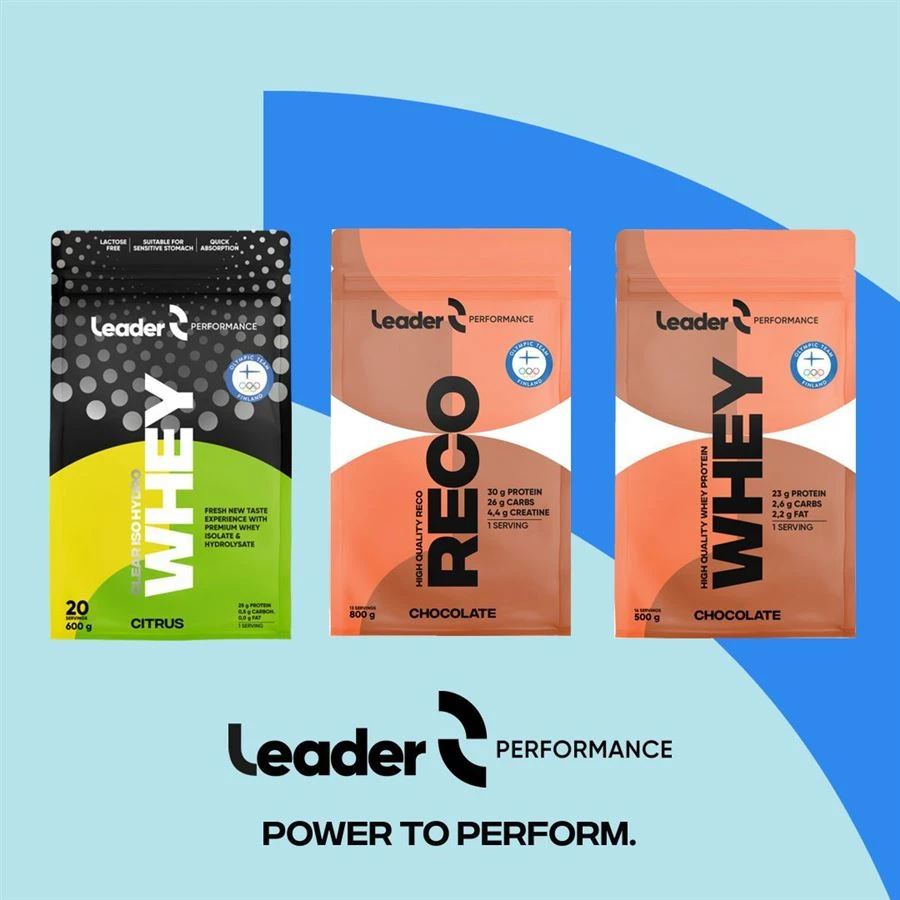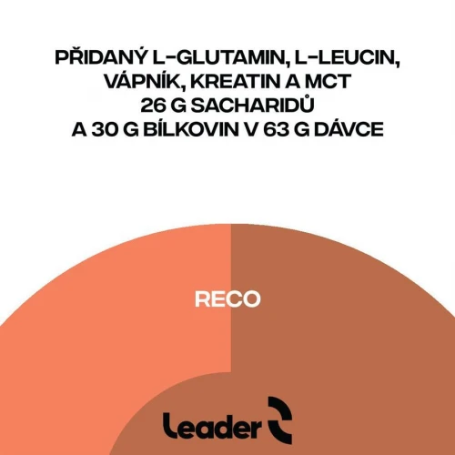 Leader Reco je navržený tak, aby pomohl tělu zotavit se po sportovním výkonu. Dlouhotrvající nebo náročný silový trénink tělo zatěžuje, proto potřebuje energii a stavební látky pro regeneraci. Reco obsahuje optimální množství kvalitního syrovátkového proteinu (původ Velká Británie) pro obnovu svalových vláken a dostatek kvalitních sacharidů pro obnovu svalového glykogenu. Reco dále obsahuje L-glutamin, L-leucin a kreatin, aminokyseliny podporující regeneraci a růst svalové hmoty.