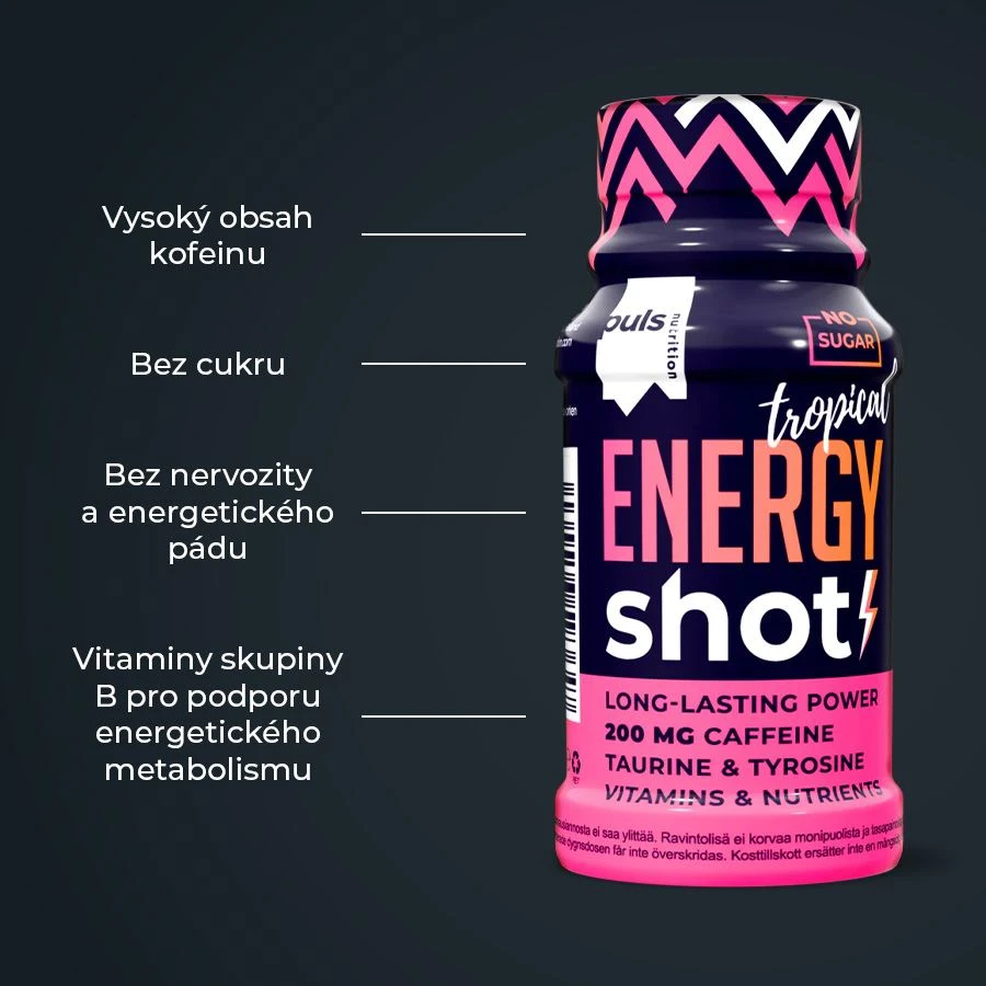 Nabijte se Puls Energií pro optimální výkon! Tento shot bez cukru je navržen tak, aby podpořil vytrvalost, ale i dlouhotrvající soustředění. Obsahuje účinné dávky kofeinu, taurinu, L-tyrosinu, cholinu, extraktu ze zeleného čaje a vitaminů skupiny B. Díky praktickému balení se snadno přenáší a rychle konzumuje ve chvílích, kdy je potřeba dodat energii nejvíce. Ideální pro jakoukoli situaci vyžadující energii a skvělá alternativa k energetickým nápojům. Kofein pomáhá zlepšovat koncentraci a bdělost a zároveň přispívá ke zvýšení vytrvalostního výkonu a vytrvalostní kapacity. Taurin, L-tyrosin, cholin a extrakt ze zeleného čaje jako známé a osvědčené složky pro dlouhotrvající soustředění. Žádné kompromisy z hlediska jedinečné chuti a složení. Finská značka PULS NUTRITION patří ve všech ohledech k absolutní špičce sportovní a doplňkové výživy.