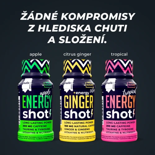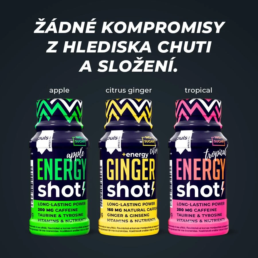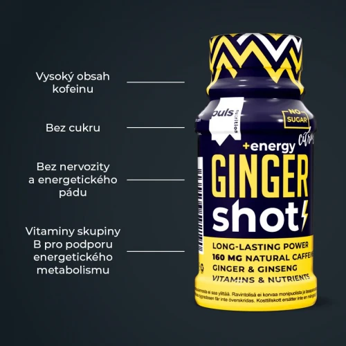 Nabijte se Puls Energií pro optimální výkon! Tento shot bez cukru je navržen tak, aby podpořil vytrvalost, ale i dlouhotrvající soustředění a obranný štít! Obsahuje účinné dávky kofeinu, extraktu ze zázvoru, kurkumy, sibiřského ženšenu vitaminů skupiny B a vitamińu C. Díky praktickému balení se snadno přenáší a rychle konzumuje ve chvílích, kdy je potřeba dodat energii nejvíce. Ideální pro jakoukoli situaci vyžadující energii a skvělá alternativa k energetickým nápojům. Kofein pomáhá zlepšovat koncentraci a bdělost a zároveň přispívá ke zvýšení vytrvalostního výkonu a vytrvalostní kapacity. Extrakty ze zázvoru, kurkumy, sibiřského ženšenu jsou osvědčené složky pro posílení obranného štítu. Žádné kompromisy z hlediska jedinečné chuti a složení. Finská značka PULS NUTRITION patří ve všech ohledech k absolutní špičce sportovní a doplňkové výživy.