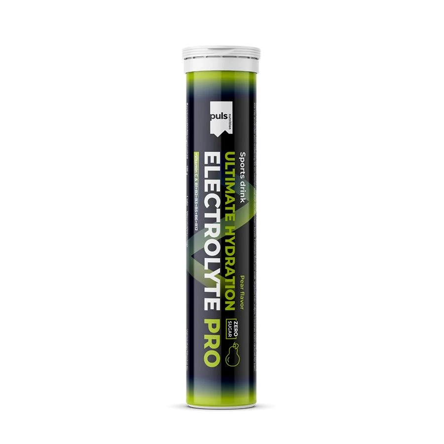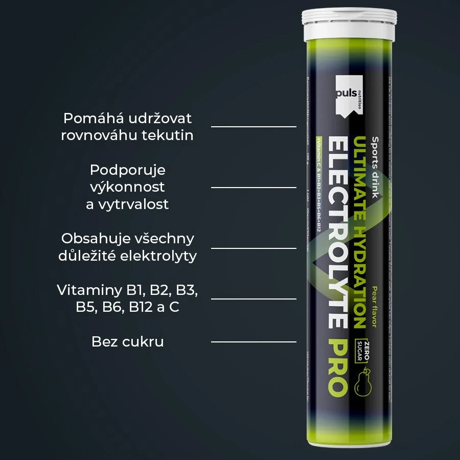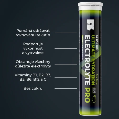 Hydratace jednoduše. Šumivá tableta PULS Electrolyte PRO představuje efektivní způsob, jak zahnat žízeň a rychle podpořit rovnováhu tekutin v těle. Stačí rozpustit ve vodě a vychutnat si sladkou hruškovou chuť bez cukru. Hotový hydratační nápoj obsahuje všechny důležité elektrolyty a také vitaminy C, B1, B2, B3, B5, B6 a B12. Je navržen pro podporu výkonu a vytrvalosti. Obsahuje hořčík, který přispívá k normální činnosti svalů a pomáhá snižovat míru únavy a vyčerpání. Vitaminy B1, B3, B6 a B12 přispívají k normálnímu energetickému metabolismu a k normální činnosti nervové soustavy.