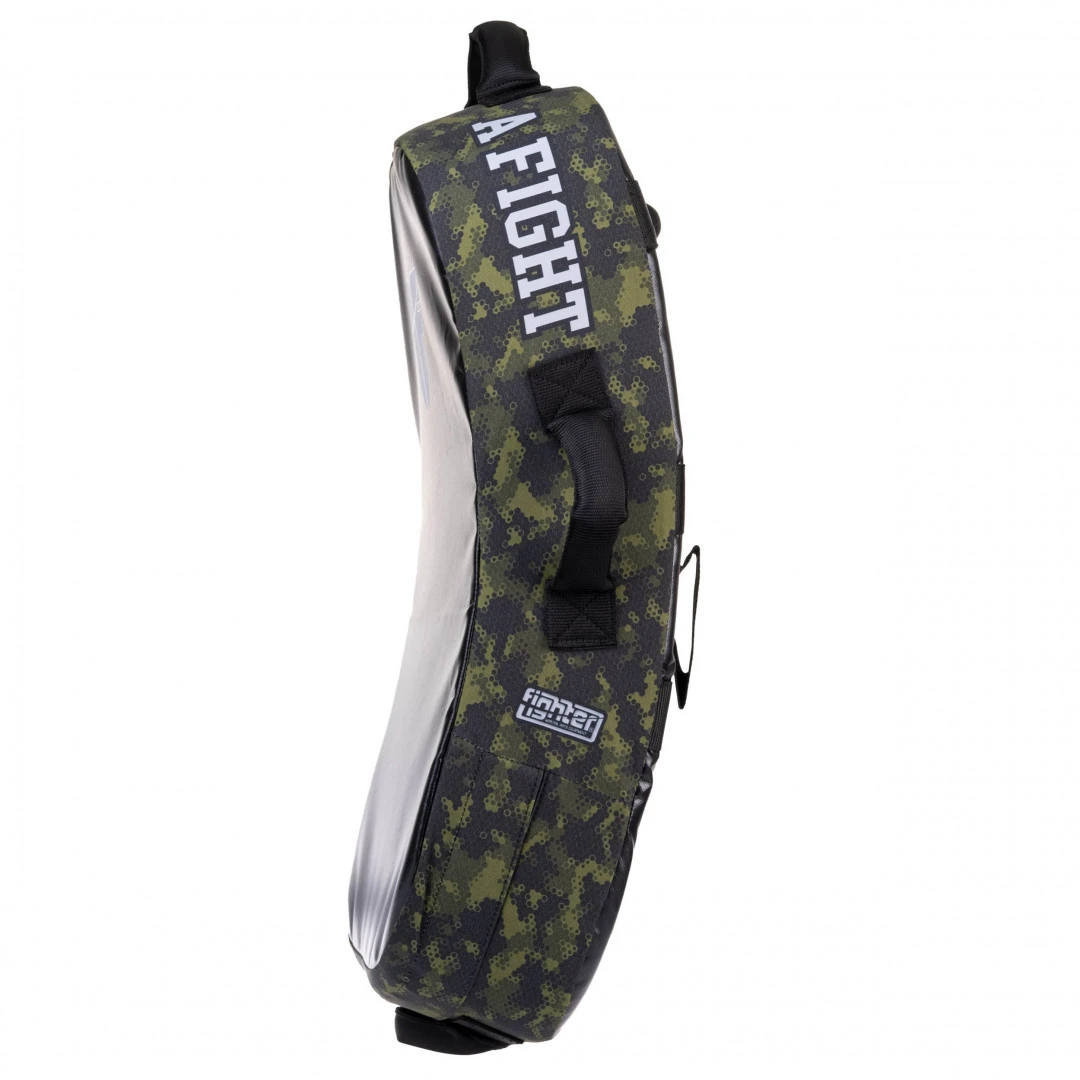 Lapa Fighter - MULTI GRIP - Life is a Fight - Green Camo v oválném tvaru je vyrobena pro nácvik kopů a úderů. Tento mírně prohnutý blok má pro větší bezpečnost zakulacené rohy a perfektní ergonomický tvar. Lapa je nově vybavena pěti úchyty a pro větší variabilitu tréninku nechybí ani tři popruhy na zadní části. Výplň tvoří speciální molitanová směs, lapa tedy skvěle pohlcuje i ty nejsilnější údery. Díky univerzálnosti je blok vhodný pro většinu bojových sportů. vysoká životnost výrobku vyrobeno v České republice všechny použité materiály jsou z EU jednoduché upínání na suchý zip potisk ze strany je sublimovaný