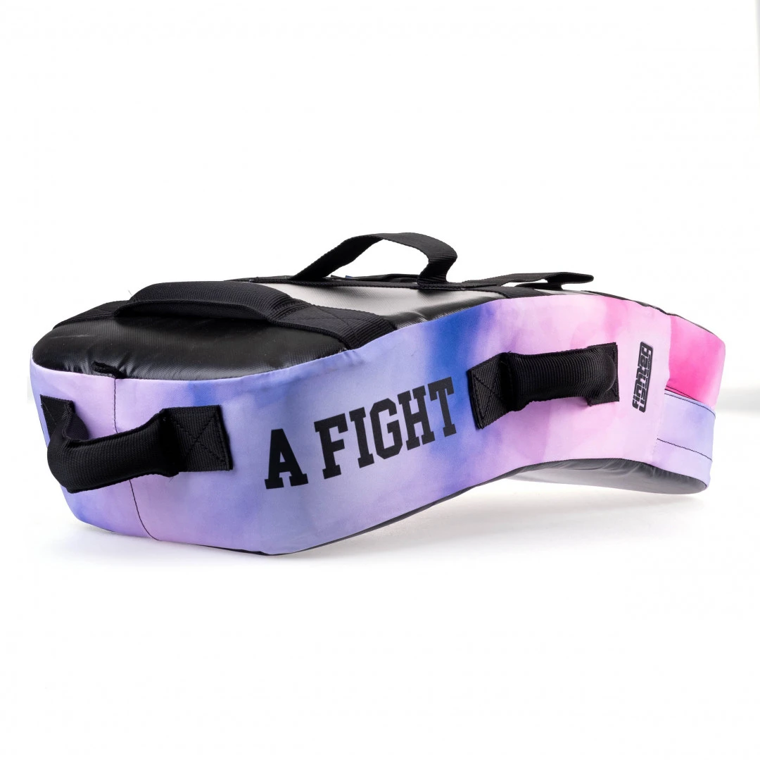Lapa Fighter - MULTI GRIP - Life is a Fight - Pink v oválném tvaru je vyrobena pro nácvik kopů a úderů. Tento mírně prohnutý blok má pro větší bezpečnost zakulacené rohy a perfektní ergonomický tvar. Lapa je nově vybavena pěti úchyty a pro větší variabilitu tréninku nechybí ani tři popruhy na zadní části. Výplň tvoří speciální molitanová směs, lapa tedy skvěle pohlcuje i ty nejsilnější údery. Díky univerzálnosti je blok vhodný pro většinu bojových sportů. vysoká životnost výrobku vyrobeno v České republice všechny použité materiály jsou z EU jednoduché upínání na suchý zip potisk ze strany je sublimovaný