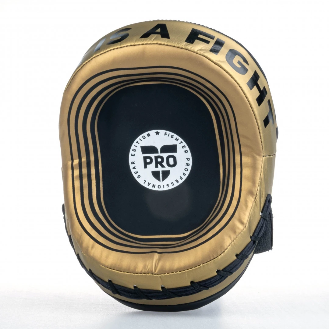 Fighter oválná lapa Pro Small - černá/zlatá Pro Fighter Edition je určena především pro profesionální a zkušené zápasníky, kteří hledají kvalitní, ochranyschopné a pohodlné vybavení na tréninky a zápasy. Lapa je vyrobena ze syntetické kůže v zajímavých barvách a s originálním designem. Je vhodná pro trénink úderů, stejně tak, jako k rychlostnímu tréninku. Lapa je lehká a pohodlná jak při úderech, tak i při držení. Vyrobeno ze syntetické kůže Lehká a ergonomická
