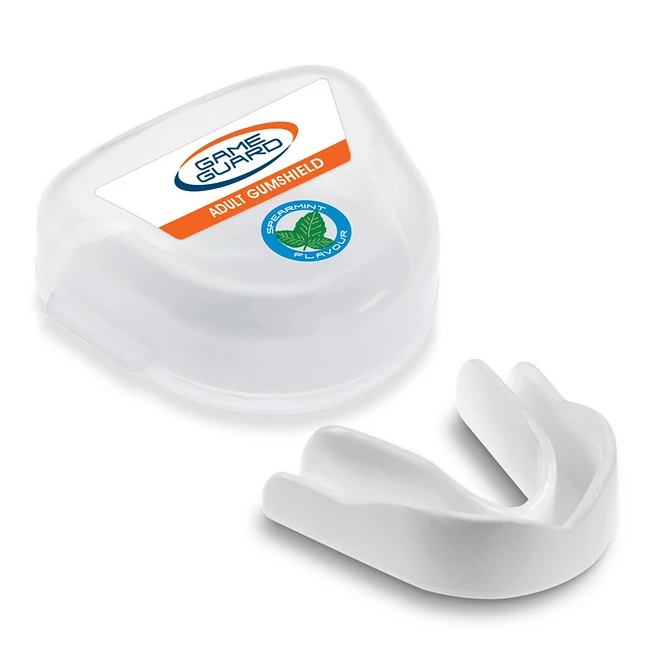 Chrániče zubů Game Guard průhledná s příchutí máty Perfektní chránič za skvělou cenu! Tento chránič byl vyvinut v Anglii s ohledem na potřeby ochrany zdraví v novodobých sportech. Chrániče jsou vhodné pro všechny bojové sporty i jiné kontaktní sporty. Tento výrobek se dodává v několika barvách a některé modely se dokonce dodávají s vůní/příchutí. Součástí balení je pevná a pružná krabička. Bez BPA a latexu. Vyrobeno z EVA plastu. Snadno se tvaruje, poskytuje optimální ochranu. Chrání zuby a pomáhá snižovat riziko vážných poranění úst a čelistí. V balení s krabičkou. Ideální pro všechny kontaktní sporty. Pokud chránič napoprvé nesedí nebo je třeba upravit, jednoduše znovu natvarujte. Chránič by měl být měněn každou sezónu nebo období, protože chrániče zubů se časem stávají méně účinnými. Certifikováno pro evropský trh. Vyrobeno v Anglii. TVAROVÁNÍ: uvařte vodu v rychlovarné konvici, nebo v hrnci a nalijte do misky, do druhé misky si připravte studenou vodu na ochlazení chrániče rozbalený chránič zubů vložte do horké vody na 25-30 vteřin, chránič vyjměte z horké vody a na vteřinu ponořte do misky se studenou vodou před zrdcadlem vložte chránič do úst a vycentrujte jej, přitlačte chránič na stoličky a pak na přední zuby poté skousněte vysajte přebytečný vzduch a vodu, prsty chránič tvarujte tlakem na zuby ze všech stran vyndejte chránič a ponořte do studené vody, aby materiál zatuhnul a vyzkoušejte jestli dobře sedí pokud chránič není dokonale vytvarovaný(padá ze zubů), opakujte tvarování po dokončení tvarování můžete malými nůžkami odsřihat přebytečný materiál Vysoká kvalita. Vyrobeno ve Velké Británii. Označení CE a testováno v souladu s BSI DD 253:2001 - splňuje normu pro velikost, lícování, držení, úroveň 2 pro přenášenou sílu (testování nárazem) a kvalitu.