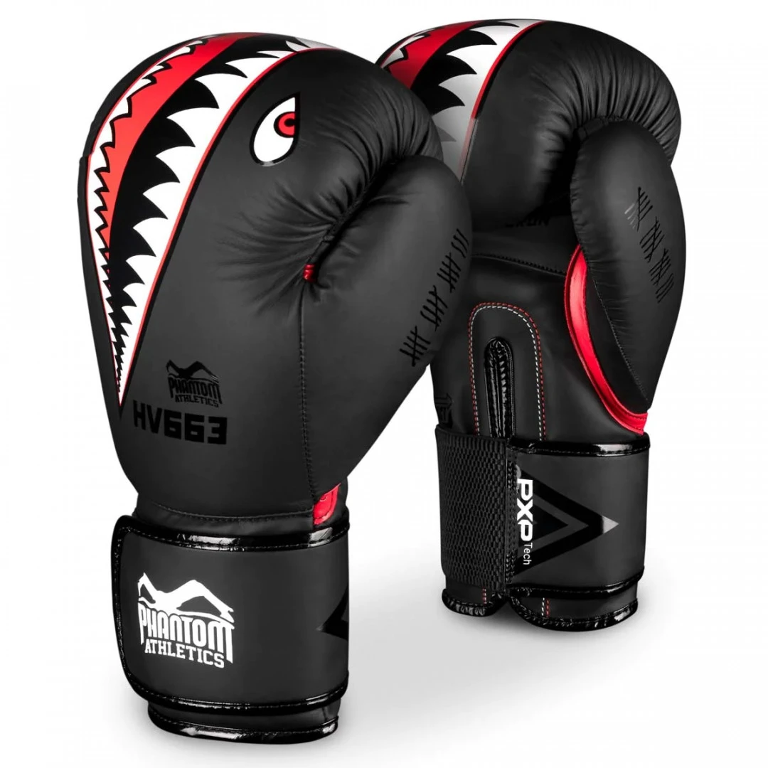 PHANTOM Boxerské rukavice Fight Squad - černé Boxerské rukavice Phantom FIGHT SQUAD vycházejí z našich nejprodávanějších modelů APEX. Jsou tedy precizně zpracované s důrazem na detail. Boxerské rukavice Fight Squad jsou vyrobeny z kvalitního materiálu (100% eko kůže) . Vynikají poutavým designem ve stylu starých bojových letounů „Shark Mouth“. Podrobnosti: - Nový materiál PU- Elastické zapínání na suchý zip - High-tech pěnové polstrování- Efektní Phantom Muay Thai design- 100% vegan PHANTOM
