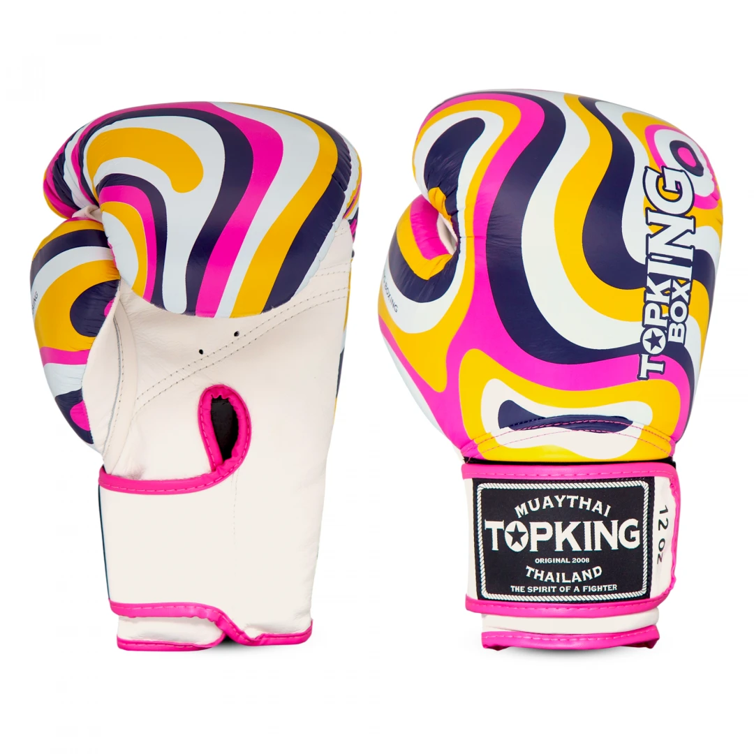 Rukavice Top King jsou vyrobeny jenom z té nejlepší výběrové kůže. Uvnitř rukavic Top King naleznete několik vrstev PUR a latexových pěn. Vrstvy jsou poskládány tak, aby chránily především oblast kloubů a další části ruky náchylné ke zranění. Palec rukavice je přichycen k rukavici. Ve spodní části rukavice je prodyšný mesh materiál, který odvětrává teplo a vlhkosti z rukavic. Značka Top King patří k tradičním Thajským značkám, které jsou na trhu již desítky let což zajišťuje ty nejlepší výrobky pro bojové sporty. Široké zapínání na suchý skvěle zpevňuje zápěstí. Ruční výroba v Thajsku!Materiál: kůže