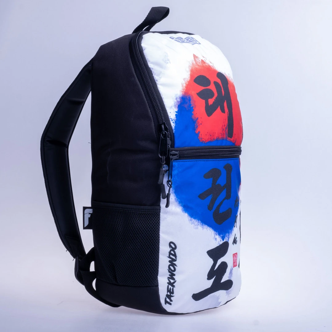 Fighter batoh - Taekwon Do od značky Fighter, která se na českém, evropském a americkém trhu specializuje na produkci špičkového vybavení pro bojové sporty a umění. Tento středně velký batoh Vám skvěle poslouží pro nošení sportovního vybavení, ale i běžných věcí. Batoh je vyroben z nepromokavého materiálu. Vnitřní prostor obsahuje kapsu na notebook a dvě menší kapsy. Celkový objem batohu je cca 15 litrů. Na vnější přední straně je umístěna větší kapsa na zip. Dvě boční kapsy pro uložení láhví jsou samozřejmostí. Záda jsou vyztužená. Popruhy jsou podšité měkčenou koženkou. Vyrobeno v České republice Sublimovaný tisk Všechny použité materiály vyrobené v EU Kapsy na láhve na bočních stranách batohu
